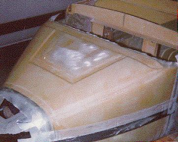 I liked this shape, plus it gives me room to adjust the direction of the light. I drew this shape on my nose cone and then melted a 6"x6" piece of the lexan in my oven at ~300 degrees F. After about 5 minutes the material was very soft and pliable and I placed in over the nose cone and pressed it into shape while it cooled. Next I cut the openings out of the nose cone and trimmed the lexan to within 1/8" of this size and beveled the edges of the lexan and the nose cone cutouts. It was here that I made a big mistake. I masked off the windows so that they would not get scratched, but only on the outside. I flox'd and glassed the windows in place and let it cure. When I checked it later I realized that the epoxy had run onto the windows from the glass cloth and ruined both pieces. Aaaargghh!! I calmed down and tried to figure out what to do next since I didn't want to re-invest $70 into a new nose cone. I carefully cut the windows out with a jig saw and used my dremel tool grinding attachment to grind away the flox and fiberglass. I then used some duct tape to put the original nose cone cutouts back into place and flox'd the seams. After curing I sanded and filled the voids with micro until I had the nose cone back to its original condition. This time I made a female mold off of the nosecone to use as a form for the new windows and started the whole process again, except this time I masked BOTH sides of the windows prior to floxing it in place. After this cured, I spray painted the inside of the nose cone flat black to keep the glare down to a minimum. I also painted the forward face of F-0 and the nose cone support bulkheads. I pealed off the protective masking tape from the inside of the windows, gave them a good cleaning and flox'd the nose cone onto F-0. Here is the mold I made as well as the nose cone with windows temporarily mounted on F-0. The rough edges shown in the photo is masking tape that was eventually cleaned up before permanent mounting.